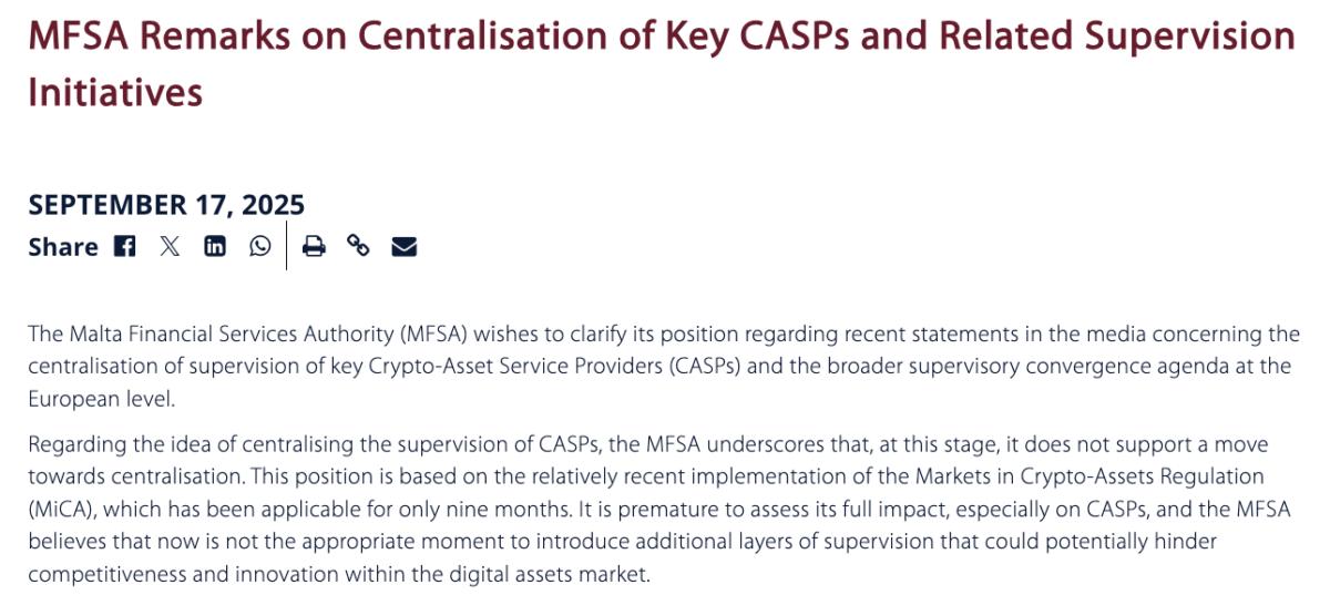 “It is premature to assess its full impact, particularly on PSAPs, and the MFSA believes that now is not the appropriate time to introduce additional layers of supervision that could potentially hinder competitiveness and innovation within the digital assets market,” the regulator said in a September 17 statement.