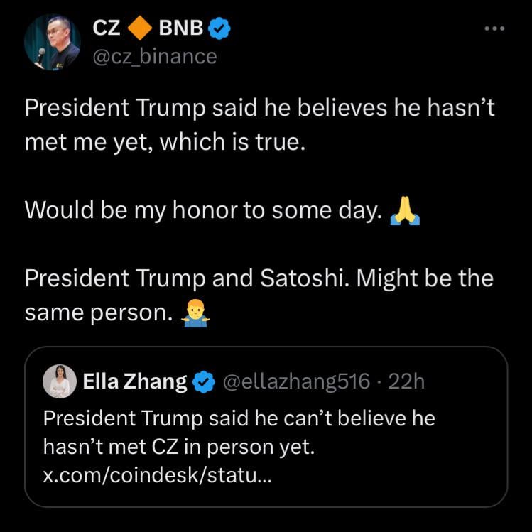 • Cz after allegedly bribing Trump fam for a pardon: “President Trump and Satoshi. Might be the same person.”