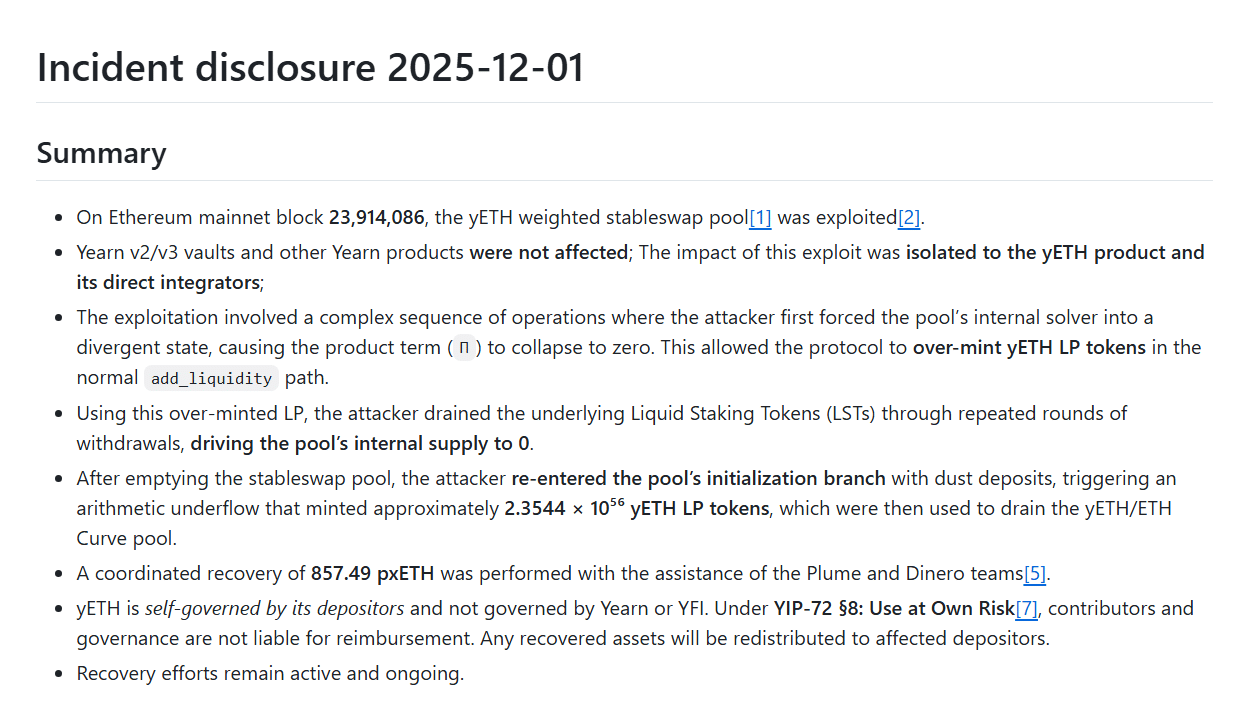 In the reportYearn said the attack hit the yETH weighted stablecoin exchange pool at block 23,914,086 on November 30, 2025.