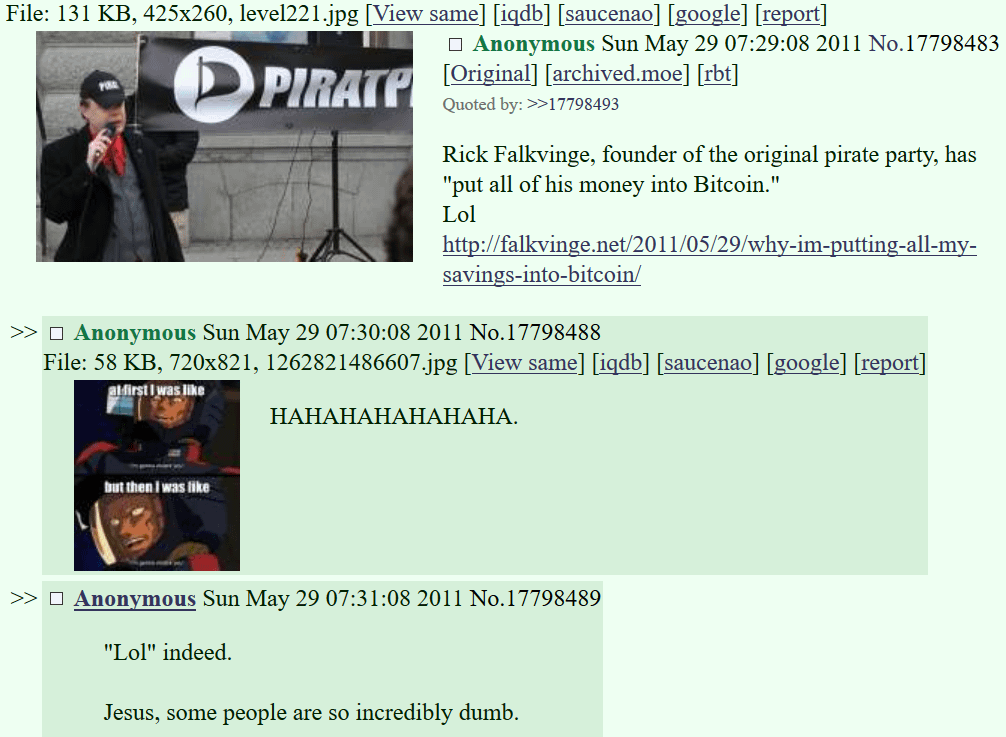 In 2011 Rick Falkvinge was ridiculed on 4chan for putting all of his money into Bitcoin