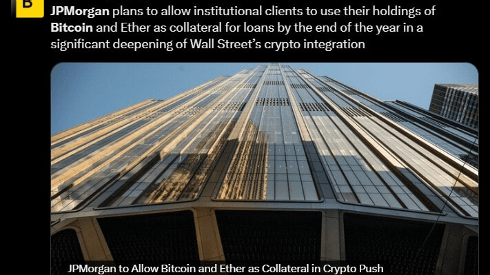 • JP Morgan to Accept Bitcoin and Ethereum as Collateral for Institutional Loans