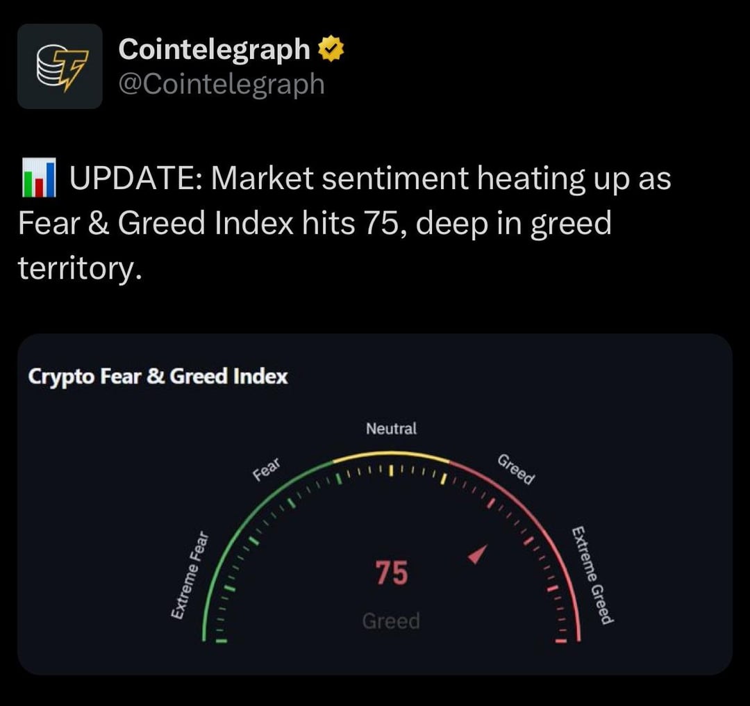 Share Facebook Twitter LinkedIn Pinterest Email Market sentiment heating up as Fear & Greed Index hits 75, deep in greed territory View Reddit by Next_Statement6145 – View Source
