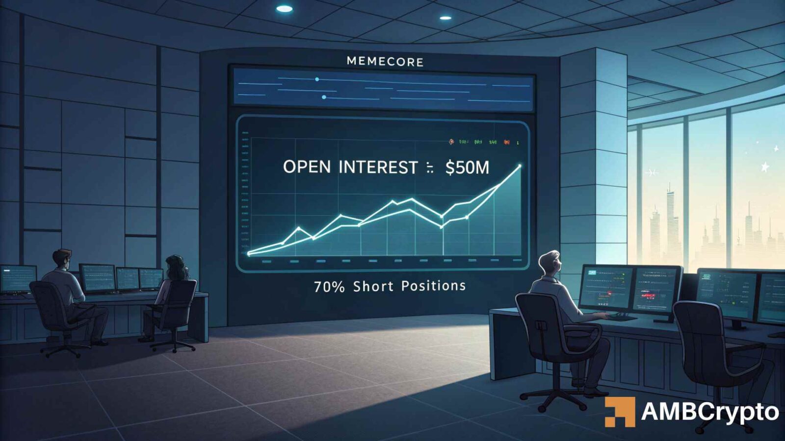 - MemeCore extends its rally with strong momentum and high OI supporting the bullish structure.