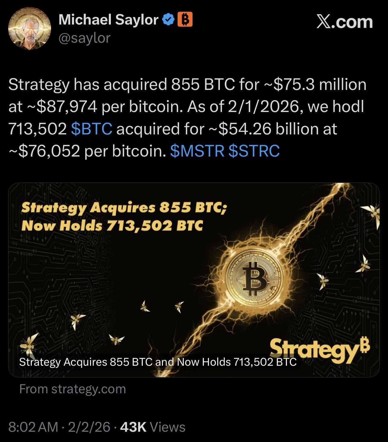 Saylor buys BTC at average price of nearly $88k. Bitcoin’s price was closer to low 80s before the weekend’s crash