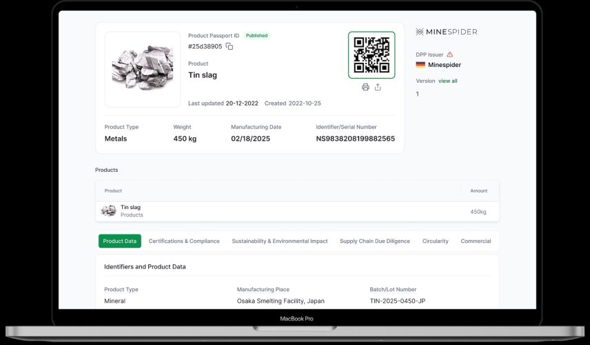 A rendering of a tin product passport, which tracks it from mine to manufacturer, on Minespider software.