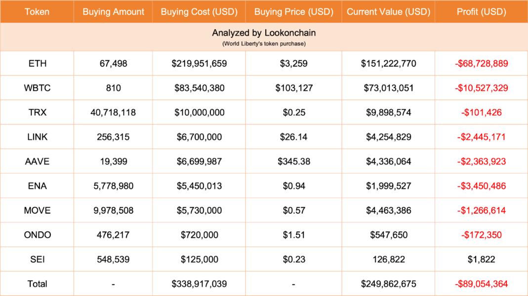 Trump’s DEFI platform is currently sitting on an unrealized total loss of more than $ 89 million on the nine tokens in which it has invested, according to Lookonchain data.