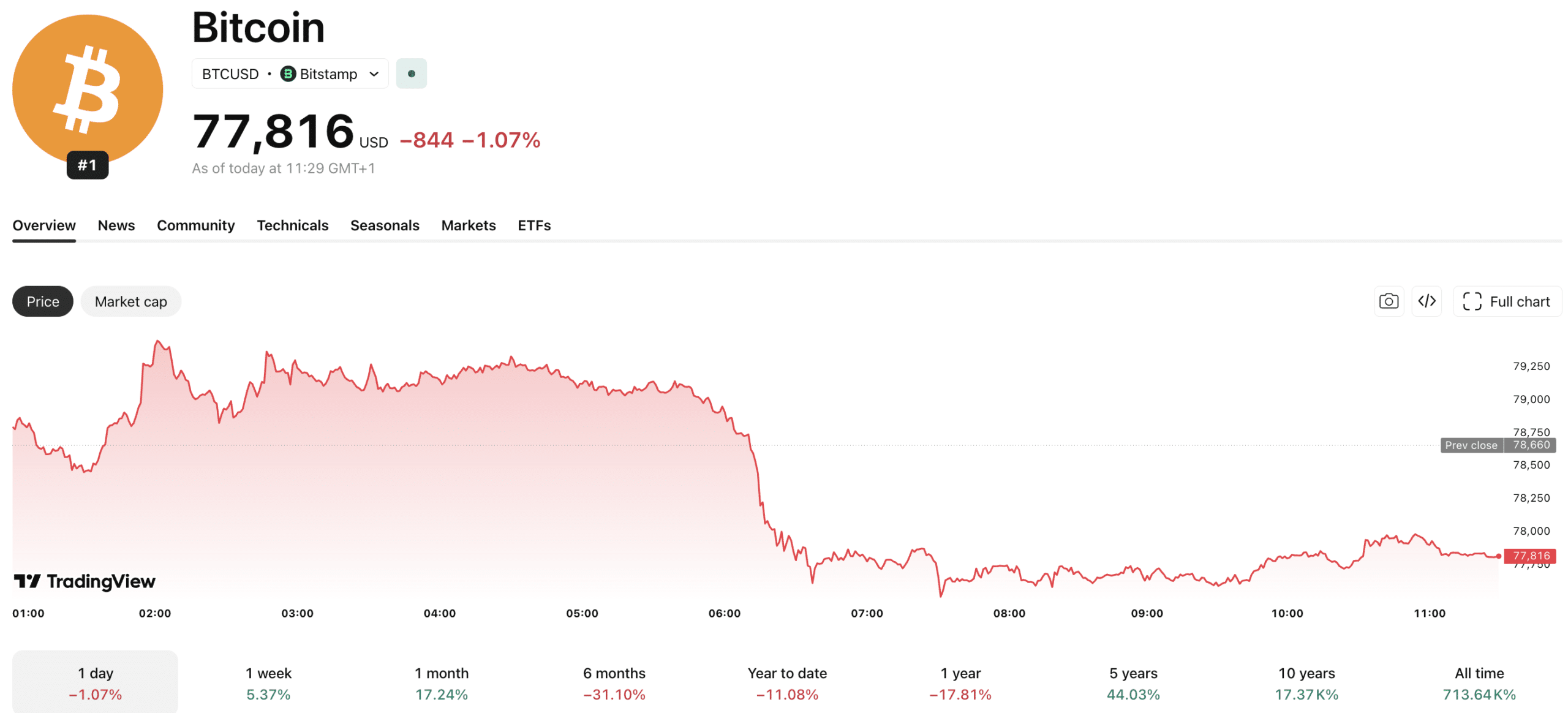 This news came as the price of Bitcoin remained stable on the day, down -0.3% to $77,700, as the leading digital asset begins the week in a period of consolidation after a sharp rise over the past fortnight.