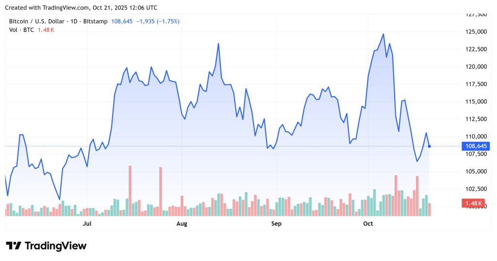 At the time of writing on Tuesday afternoon, Bitcoin (BTC) is trading at $108,645, down 1.75% in the last 24 hours.