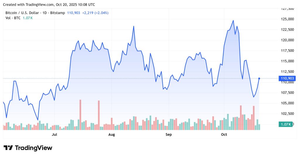 At the time of writing on Monday morning, Bitcoin is trading at $110,903, up 2.04% in the last 24 hours. The leading cryptocurrency started the day with an intraday low near $108,000 before climbing to around $111,000. BTC is now consolidating near this level, showing signs of recovery after a volatile week.