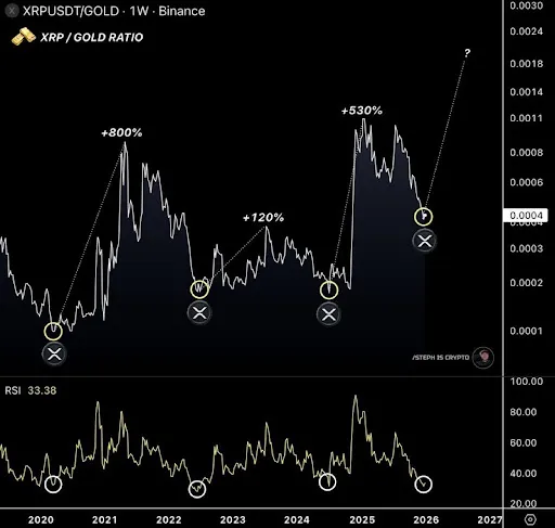 Steph is Crypto also highlighted the momentum conditions, noting that the The Relative Strength Index (RSI) has been oversold in the past when the XRP/gold ratio reached historical support. In the current 2026 cycle, the RSI is around 33.38, reflecting a similar oversold pattern as in previous cycles. According to the analyst, this suggests bearish dynamics fades.